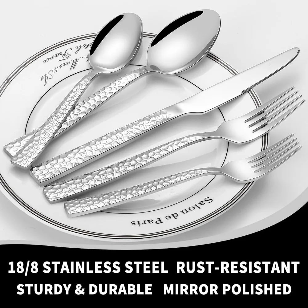 - Elegant Hammered Design: This 20-piece silverware set features a unique hammered finish on the square handles—combining timeless elegance with modern style. Perfect for elevating your dining table at home, restaurants, hotels, or special occasions.