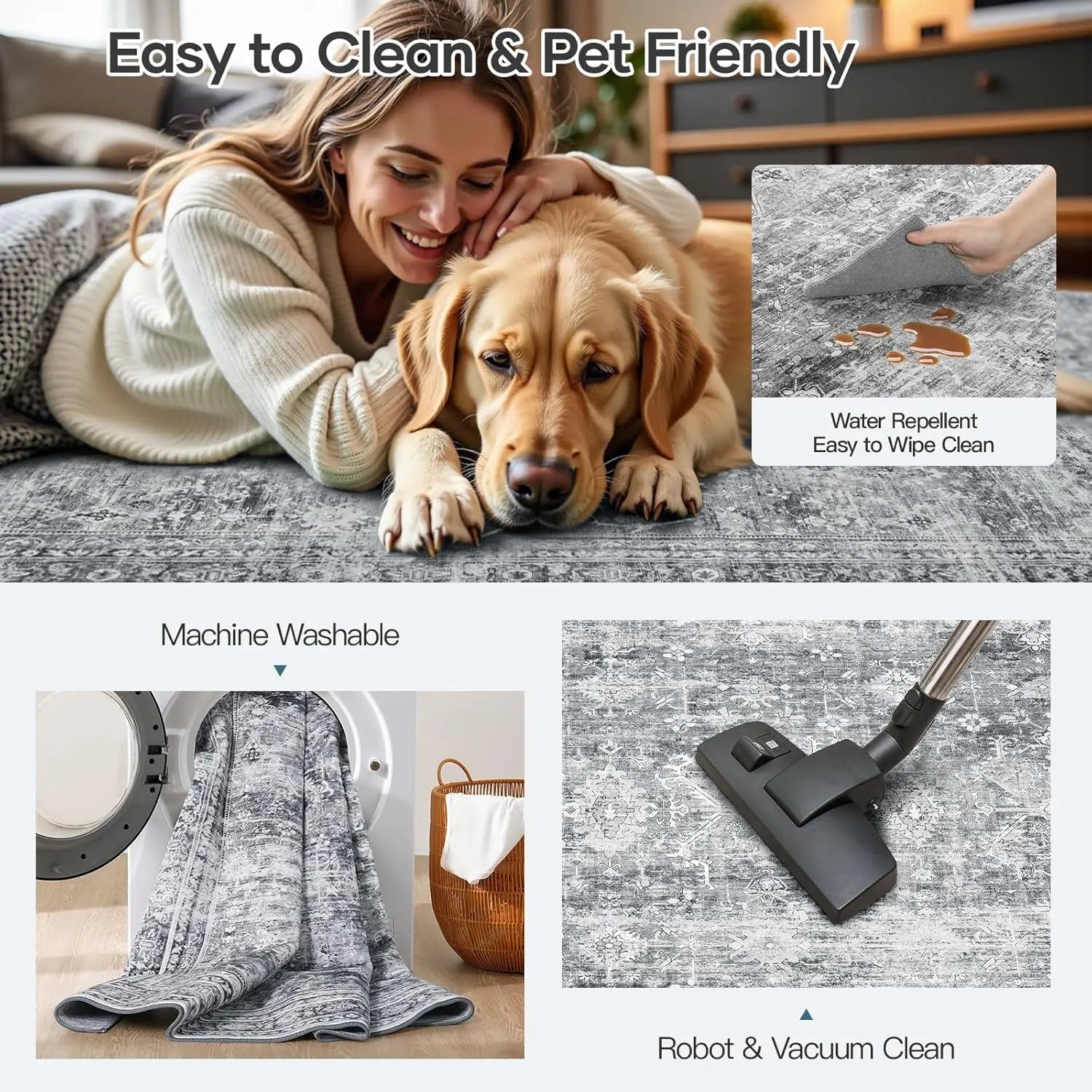 8×10 Washable Area Rug with Non-Slip Backing – Soft Grey Floral Carpet