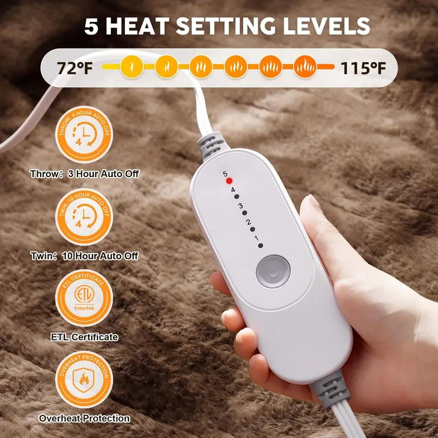 Enjoy instant warmth with this electric heated blanket featuring 5 adjustable heat levels, allowing you to customize comfort to your preference. The ETL-certified safety system includes automatic shut-off for added peace of mind—3 hours for throw size and 10 hours for twin size—so you can relax comfortably and safely.