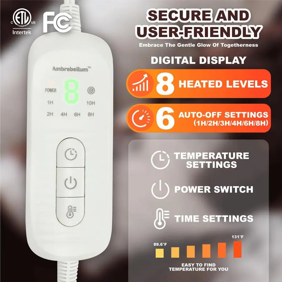 Enjoy advanced heating technology with 8 adjustable heat settings (90°F–130°F) and 6 timer options (1–10 hours). The blanket heats up in just 3 minutes, while U-shaped double-spiral heating wires distribute warmth evenly for consistent, full-body comfort.